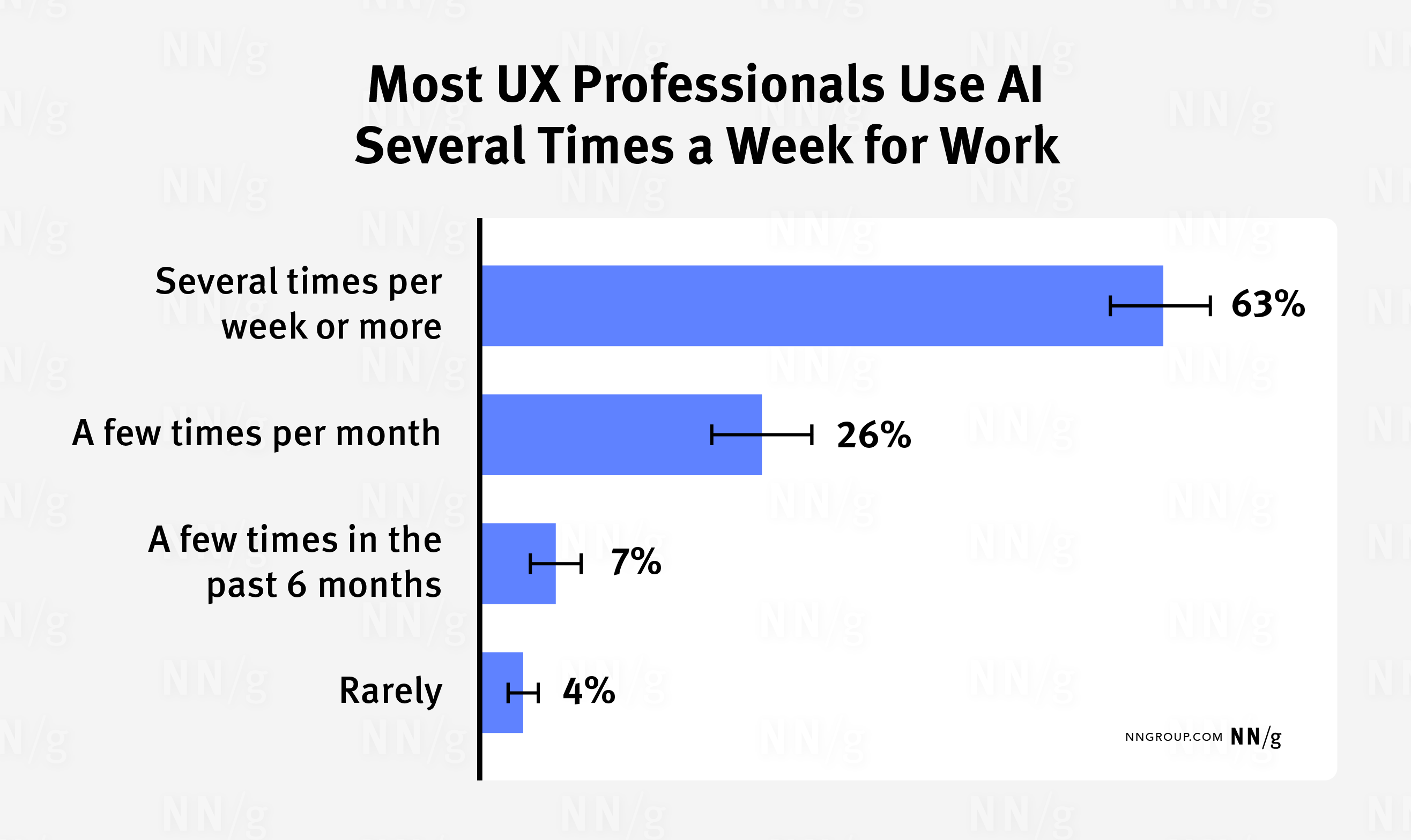 在我们调查的 680 名用户体验专业人士中,有 63% 的人至少每周在工作中使用人工智能几次。(误差条代表 95% 的置信区间。)_